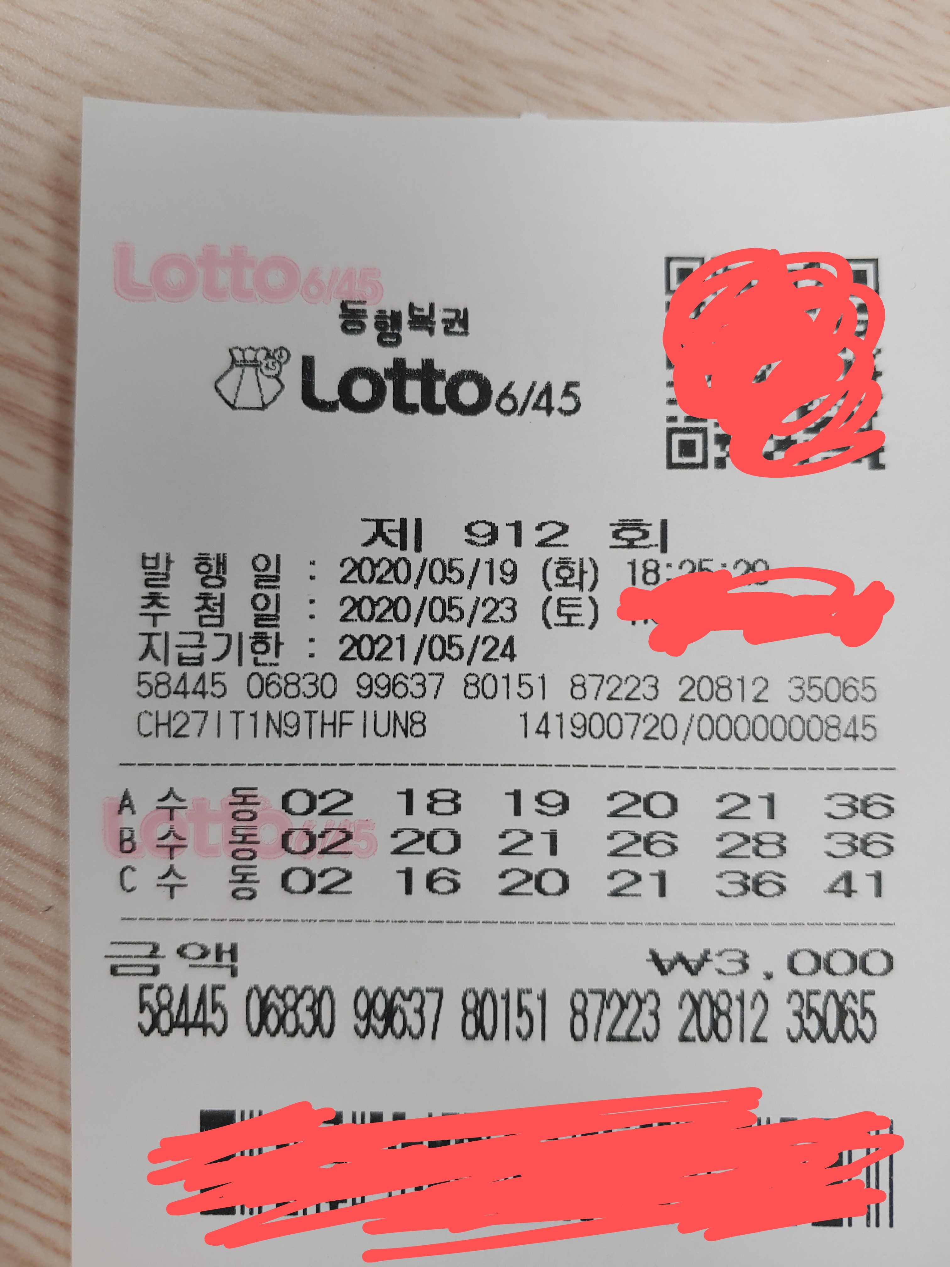 바로 위 번호는 대박을 노려보고 넣은 숫자이다