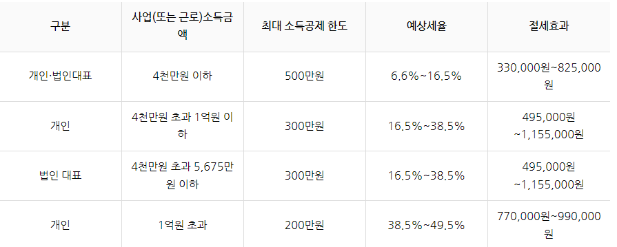 예를 들어 구분이 개인이고 소득이 4천만원 초과 1억원이하 일경우는 "300만원"원 소득공제를 받을 수 있고 절세효과는 495,000원 ~ 1,155,000원입니다.